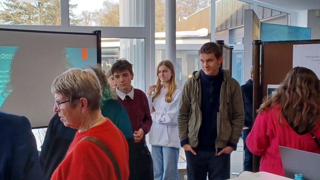Schülerinnen und Schüler der Werte-und-Normen-Kurse der 11. Klasse des Beruflichen Gymnasiums hatten sich in den letzten Wochen im Unterricht die Frage gestellt, wie Cuxhaven im Jahr 2040 aussehen sollte, um ein „Heimathafen“ vor allem auch für jüngere Bürgerinnen und Bürger der Stadt zu werden. Die zahlreichen guten Ideen – z. B. mehr Radwege, moderne Sportangebote in Parks und Hallen für alle Altersklassen, ein Uni-Standort oder auch Ideen für nachhaltigeres Leben an der Küste – wurden auf Plakaten und mithilfe einer digitalen Präsentation interessierten Bürgerinnen und Bürgern vorgestellt.